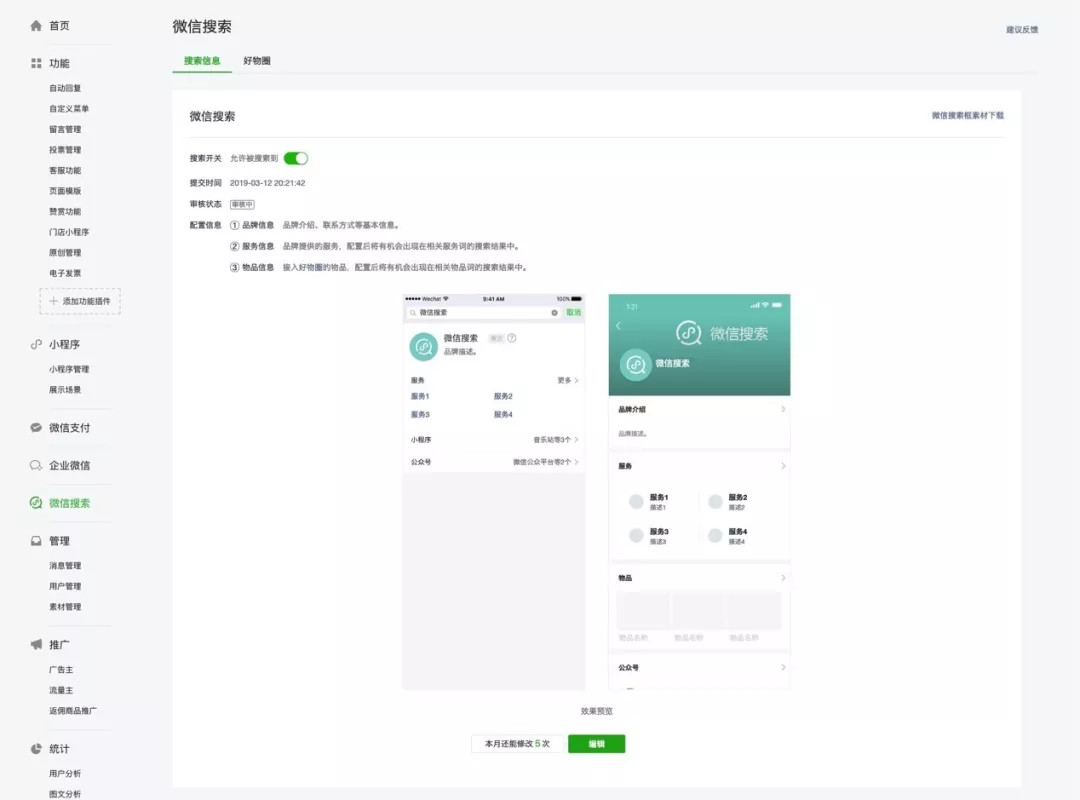 开通微信搜索后,点击“编辑”配置搜索信息;