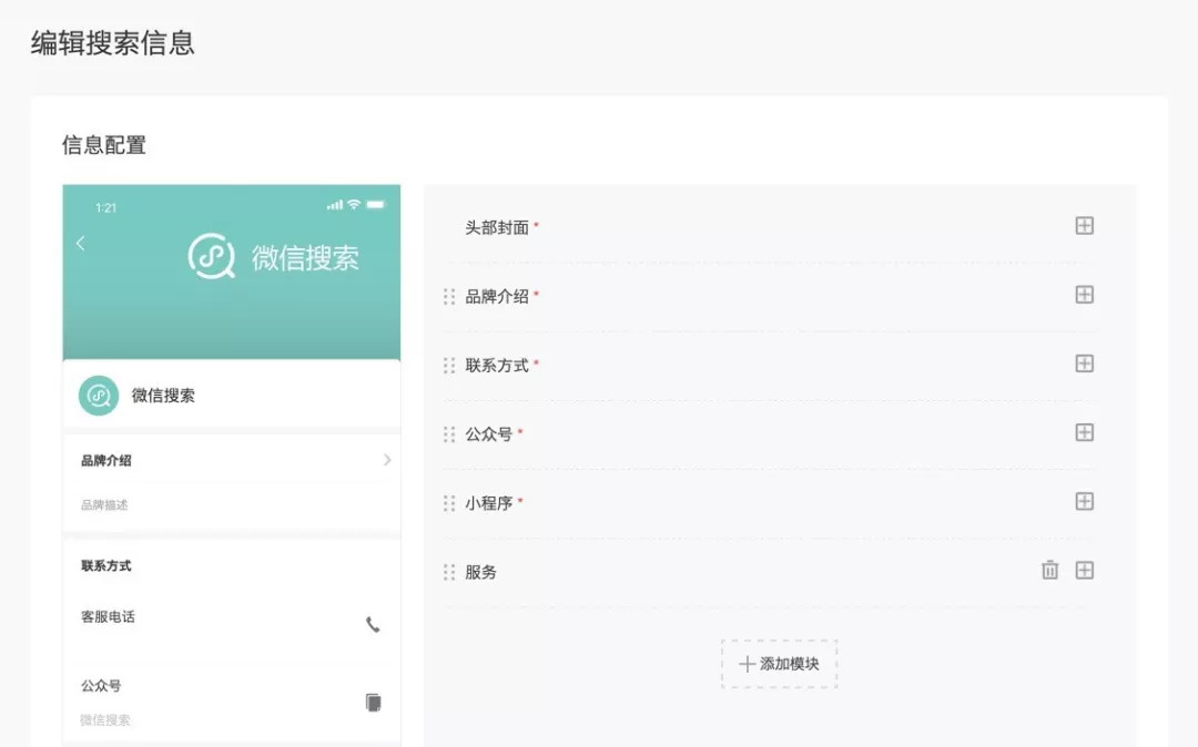 开通微信搜索后,让用户便捷地直达品牌商家的服务。开通品牌搜索的商家将获得品牌官方区和微主页的能力。
