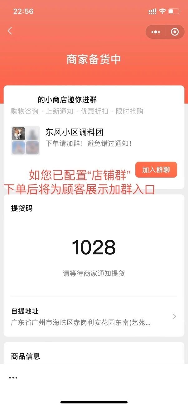 您可通过“店铺群”功能,放置微信群的二维码,买家下单后即可看到。