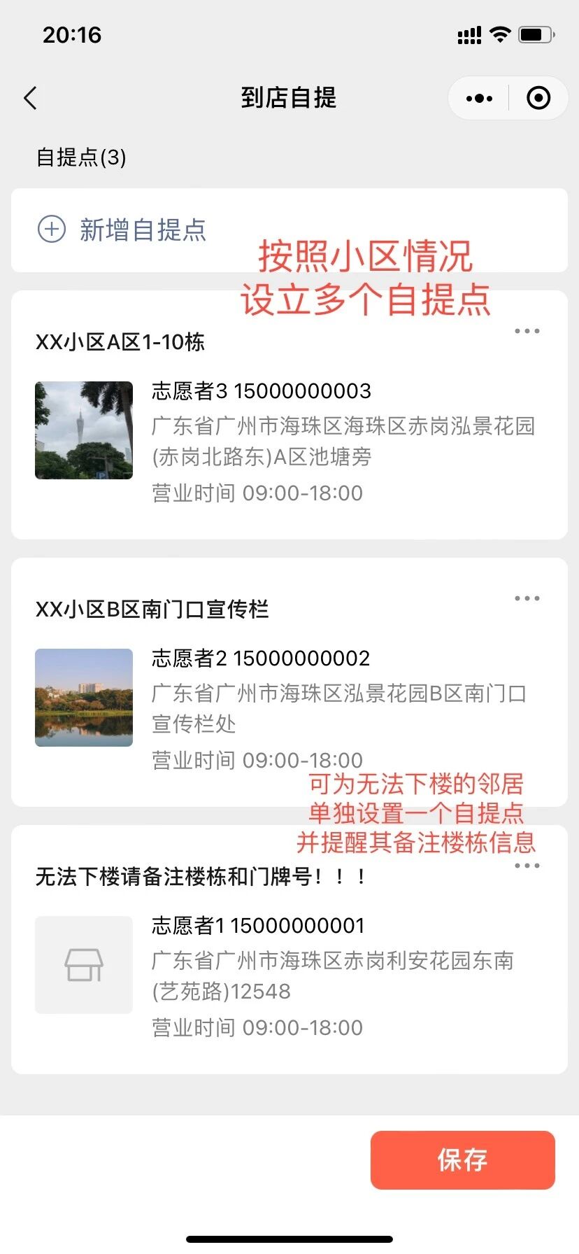 小提示:对于因疫情无法下楼取货的邻居,您可以设立一个单独的“无法下楼取货,请备注楼栋号-房间号”自提点,并根据邻居的备注信息,为其送货。