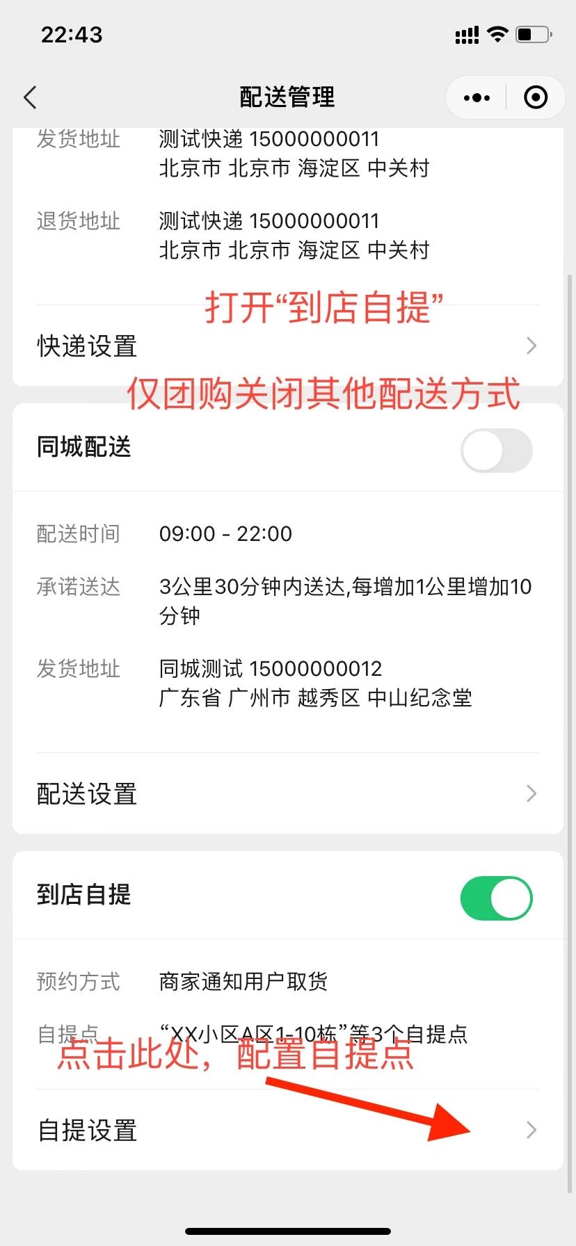 在“功能” - “配送管理”模块,您可根据小区的封控情况设立多个自提点。