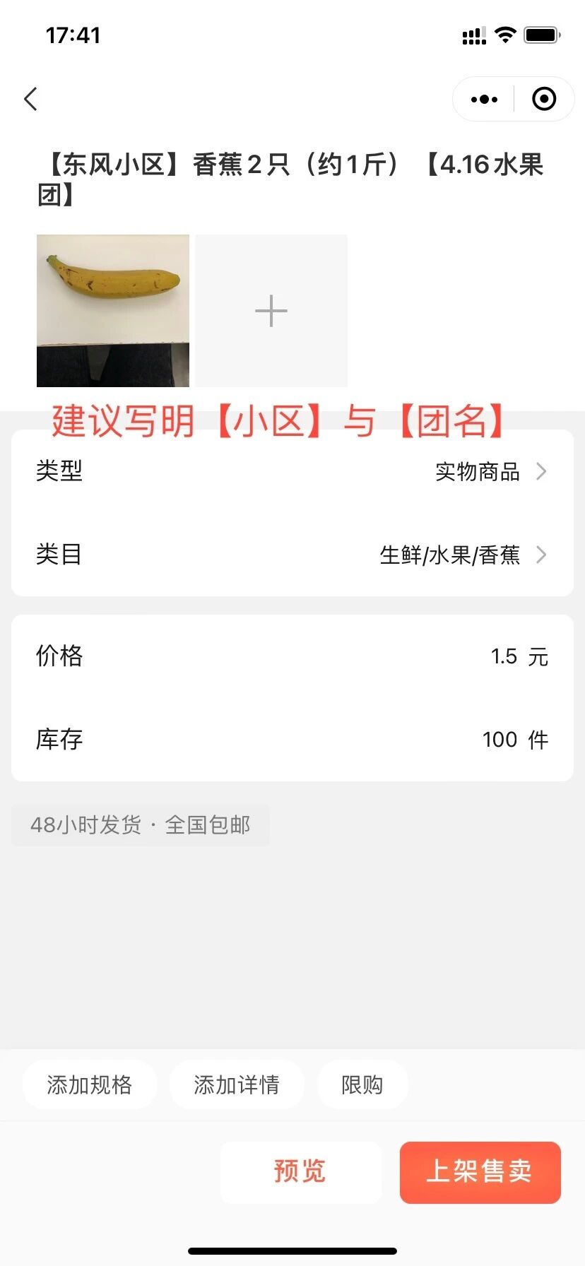 小提示:疫情管理下,您可在商品名处注明“小区”和“团名”,便于邻居确认是否能参团,也便于您查找整理订单。交易包含0.6%的支付费率,疫情物资团等非盈利团,可酌情考虑与团友均摊费率。