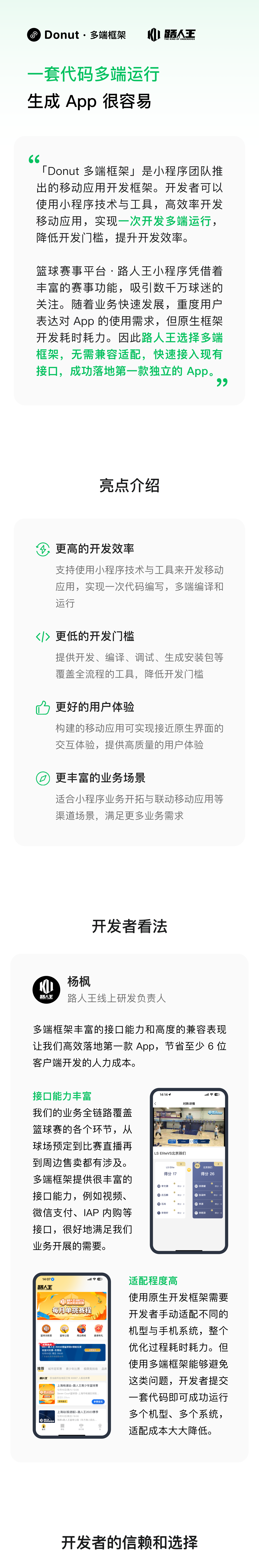 篮球赛事平台 · 路人王凭借着丰富的赛事功能,吸引数千万球迷的关注。随着业务快速发展,重度用户表达对 App 的使用需求。因此路人王选择多端框架,无需兼容适配,快速接入现有接口,成功落地第一款App。