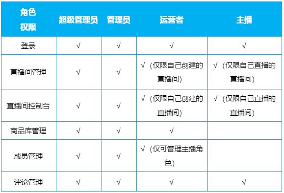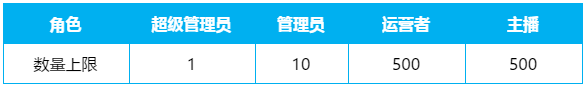 - 仅能查看并管理自己创建的直播间,仅能管理主播角色,其他权限与管理员一致;