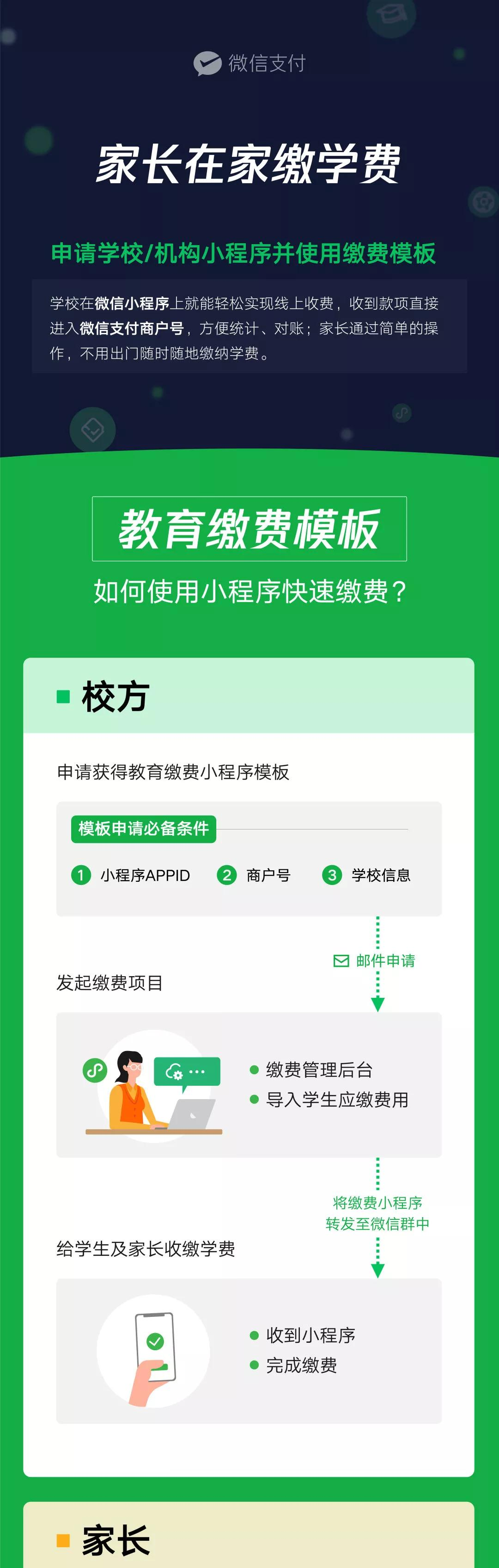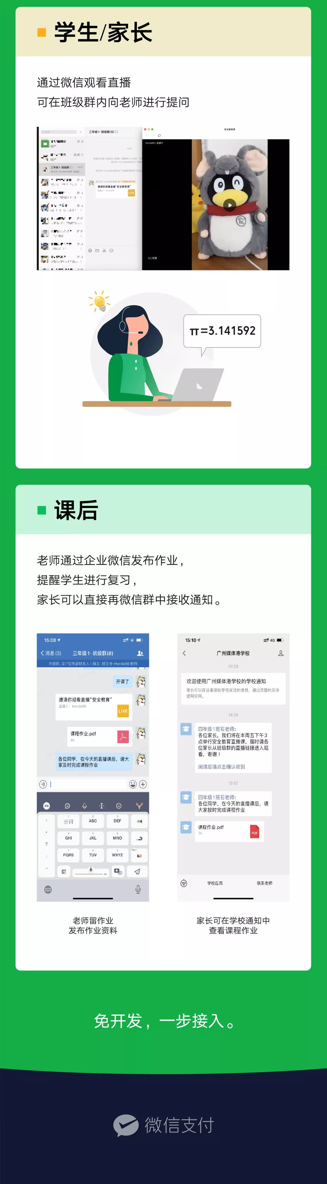 为了能让师生家长们平稳度过疫期,微信支付、小程序、企业微信携手教育行业服务商,为学校和教育机构提供了免开发、快速接入的在家上课、在家缴费解决方案。