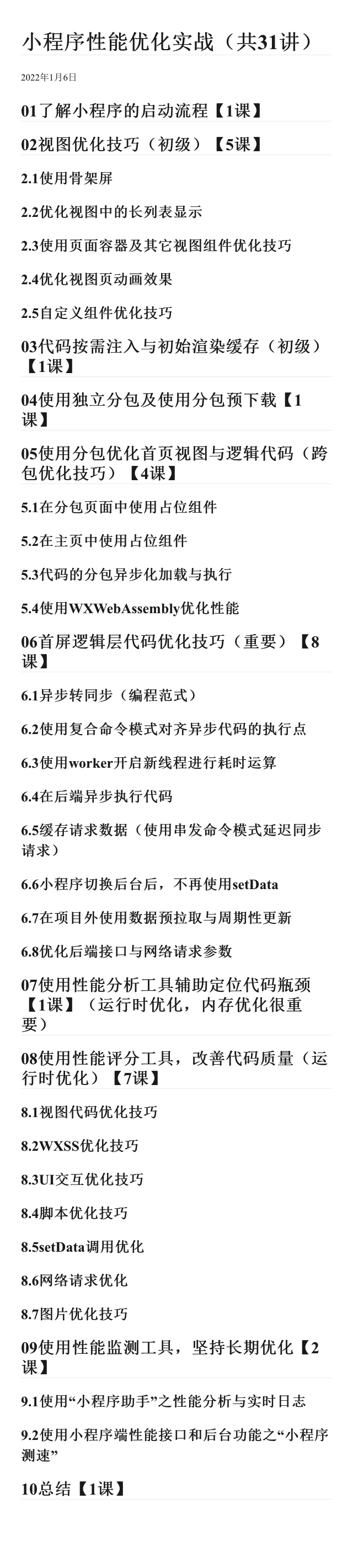 前两项多多少少或许与其他课程在方法上有些重合,但第三项,第四项关于命令模式的优化在其他地方我还没有看到过,算是这门课程的创新点,如有雷同纯属巧合。在优化策略上,整体来讲大体可以分为两类。第一类以空间换时间,例如数据预拉取,周期性更新,初始渲染缓存,使用LocalStorage缓存接口等等这些技巧,都属于以空间换时间的技巧。第二类以时间换空间,例如使用虚拟DOM,使用长列表组件,这一类都是属于以时间换空间的优化技巧,无论怎样的优化技巧,本质上精神都是一致的。精神就是现人现地,立足小程序的启动流程,双线程运行机制和重渲染机制,具体项目具体分析,以一个字节,一个字节去抠,一个毫秒,一个毫秒去节省的细致精神,一点点进行优化。在这个地方抠下了一点,在那个地方省下了一点,整体上性能就提升了。如果你在这个地方凑合一下,在那个地方也马虎一样,那么整体上性能也就下降了。