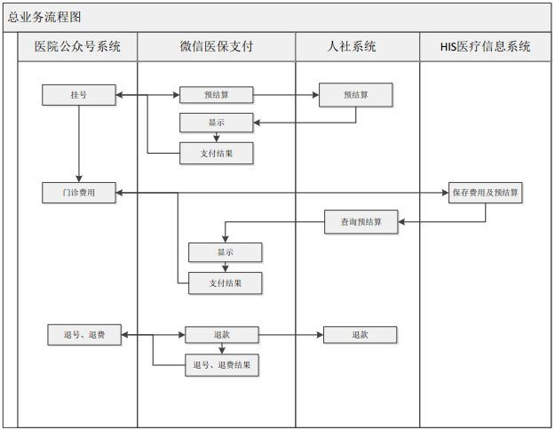 微信医保支付的业务的整体架构,可以类比微信支付,涉及的最基本的模块有三方:社保卡绑卡类比银行卡绑卡,人社局类比银行,医院类比商户。对应的类比架构如下: