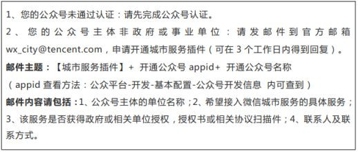 2、找到【城市服务】插件:在公众平台左边栏【功能栏】下方,找到【城市服务】插件。未能找到请点击【添加功能插件】。从插件库中选择添加城市服务插件,填写相应信息即可开通。
