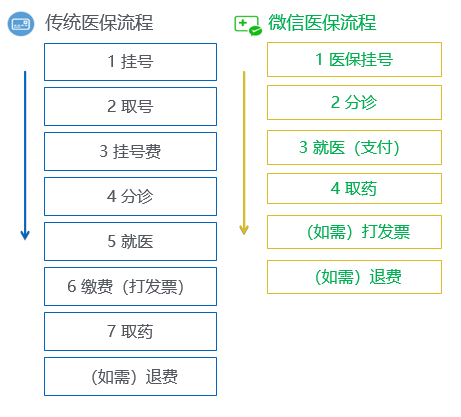 传统的医保就医流程,与微信医保支付优化后的就医流程对比如下: