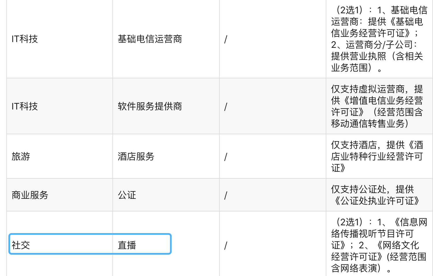 | 社交 | 直播 | / | (2选1):1、《信息网络传播视听节目许可证》;2、《网络文化经营许可证》(经营范围含网络表演)。 |