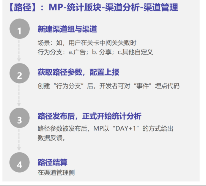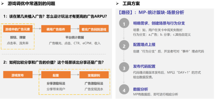 此外,平台在8月推出了一款自定义分析的方案,开发者可以明确自己的需求,确认应该分析广告点或者是分享点。同时可以配置埋点上报,发布代码配置以后可在MP-统计-场景分析或者公众后台看到全套的数据分析。