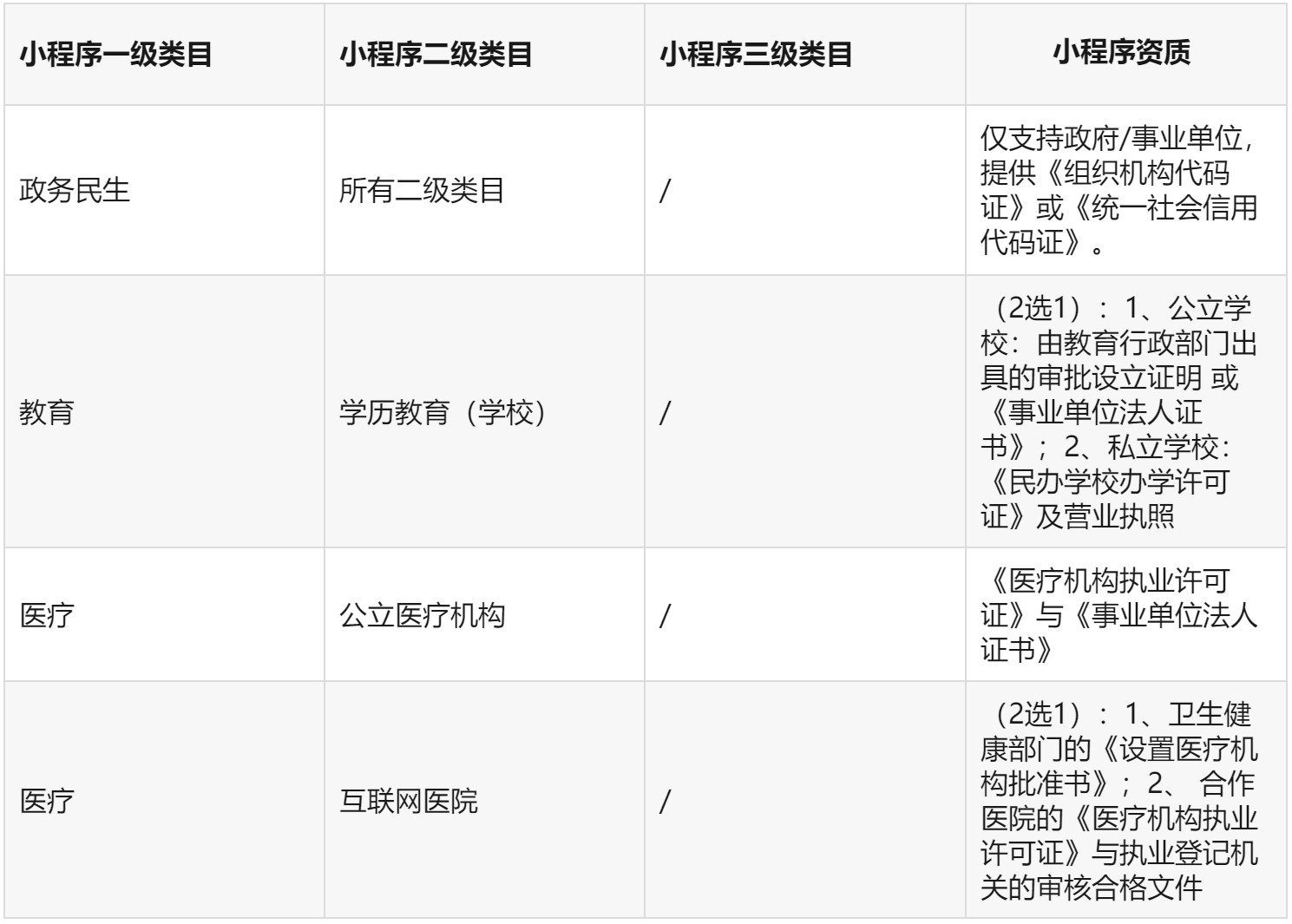 2.2、目前该组件功能针对非个人开发者,且完成了认证的小程序开放,开放的主体类目范围,如下图描述: