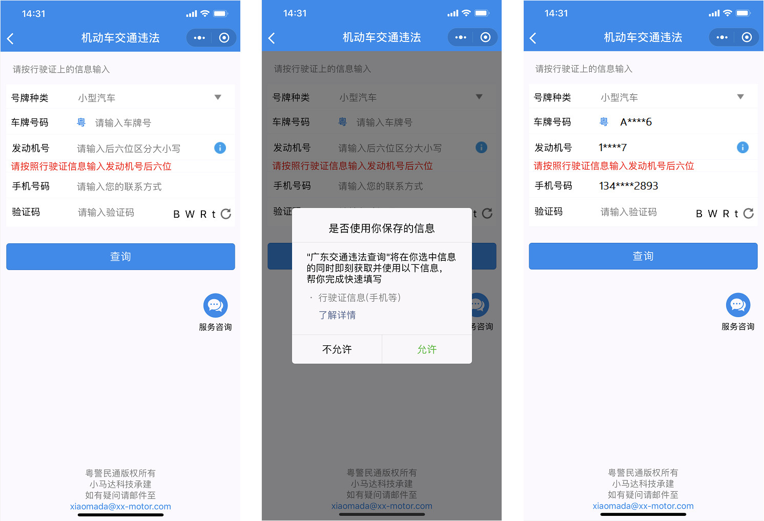 目前已经有小程序在使用此接口,如广东交通违法查询,实现截图如下(部分字段展示已掩码)。