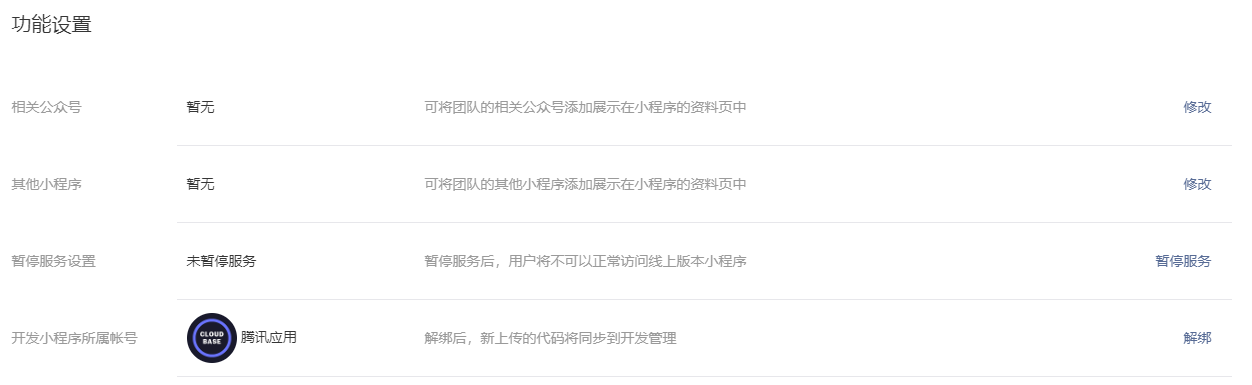 当添加成功之后,我们便可以在公众平台的设置页中看到如下信息的变化,开发小程序所属账号为我们的第三方平台的账号,此时小程序的代码上传便由第三方平台接管。