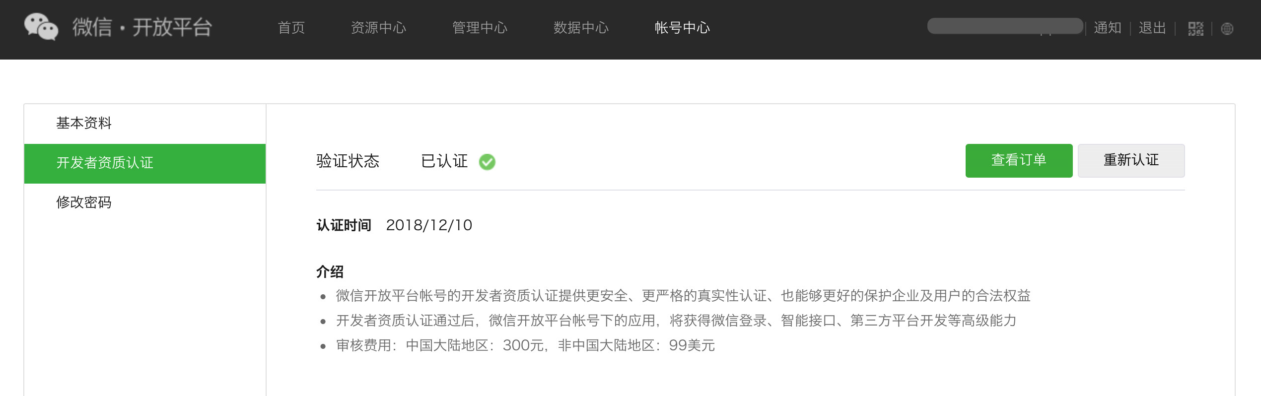 在微信开放平台https://open.weixin.qq.com/ 注册帐号,并在账号中心中,完成认证。