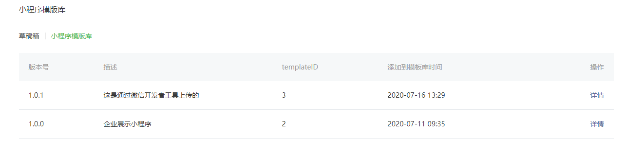 添加后在模板库中就会出现模板代码,并附带有模板编号,我们便可以通过对应的API接口直接将此模板小程序上传至指定的授权小程序中了,无需再用开发者工具上传提交。