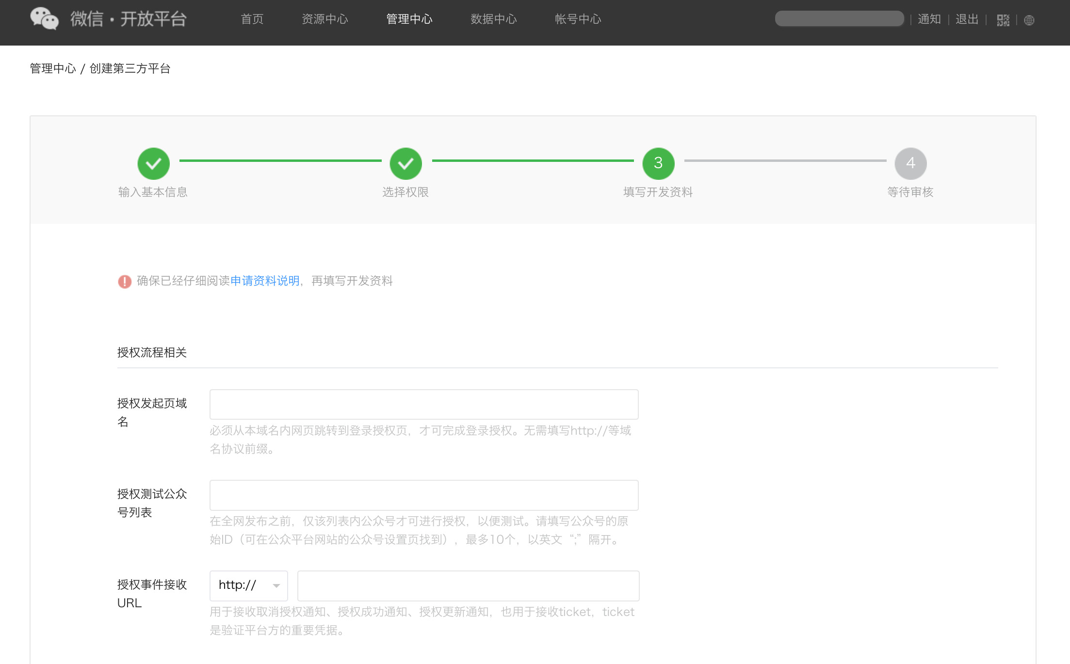 1)在“微信开放平台-管理中心-第三方平台”创建第三方平台。
