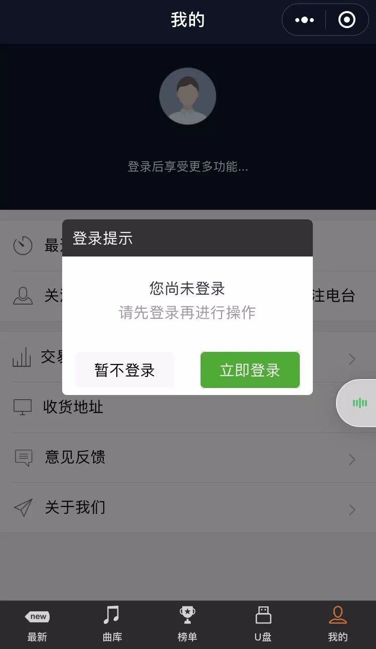 例如,在这个DJ小程序中,用户可先听音乐蹦迪授权登录后,还能关注作者、风格及电台,或购买周边商品,享受更多服务。