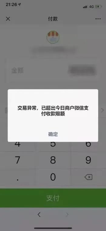 支付时显示“该商家今日已无法收款,请明天再试”、“交易异常,已超过今日商户微信支付收款额度”。