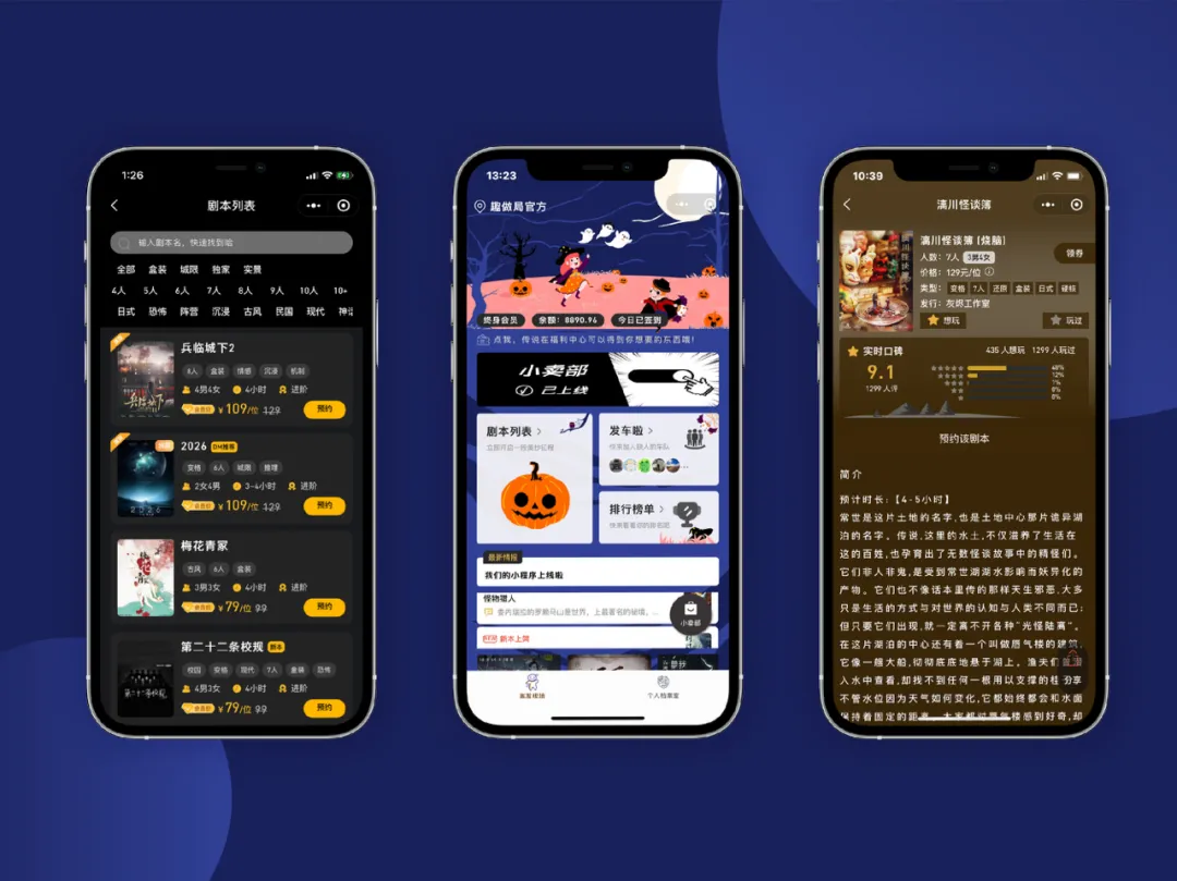和最初的设想一样,小程序分别为玩家和店家服务,对于玩家来说,可以通过小程序满足了解剧本、注册会员、扫码支付、剧本预约等需求;对于店家来说,小程序背后还有一整套的店面管理系统,可以进行会员管理、营销活动展示、数据统计、员工管理等工作。