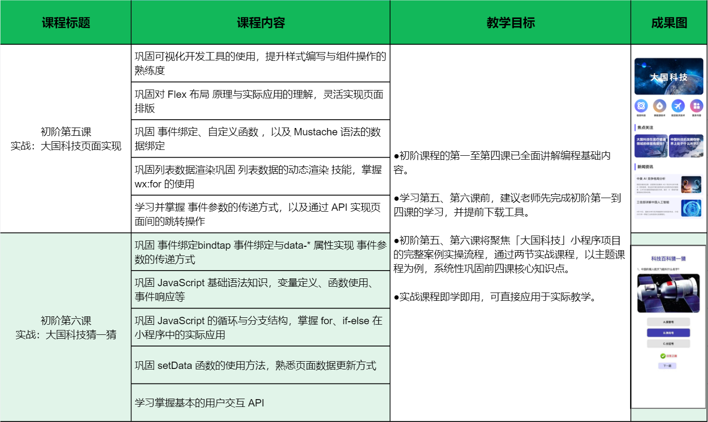 初阶第五、第六课将聚焦「大国科技」小程序项目的完整案例实操流程,通过两节实战课程,以主题课程为例,系统性巩固前四课核心知识点。