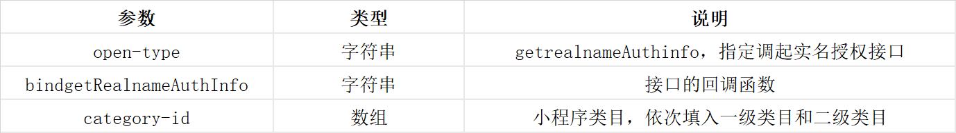 <button open-type=“getRealnameAuthInfo” bindgetRealnameAuthInfo=“authinfo” category-id="{{[99, 904]}}">实名授权</button>