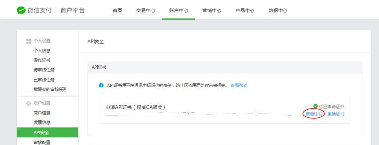 登录微信支付商户平台:pay.weixin.qq.com,进入【账户中心】->【账户设置】->【API安全】,点击“查看证书”文字按钮。