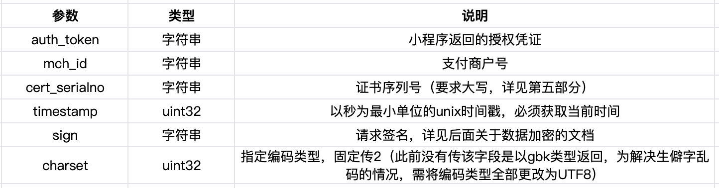 JSON=’{ “auth_token”: “xxx”, “mch_id”: “xxx”, “cert_serialno”: “xxx”, “timestamp”: 1234444, “sign”: “xxx” }’