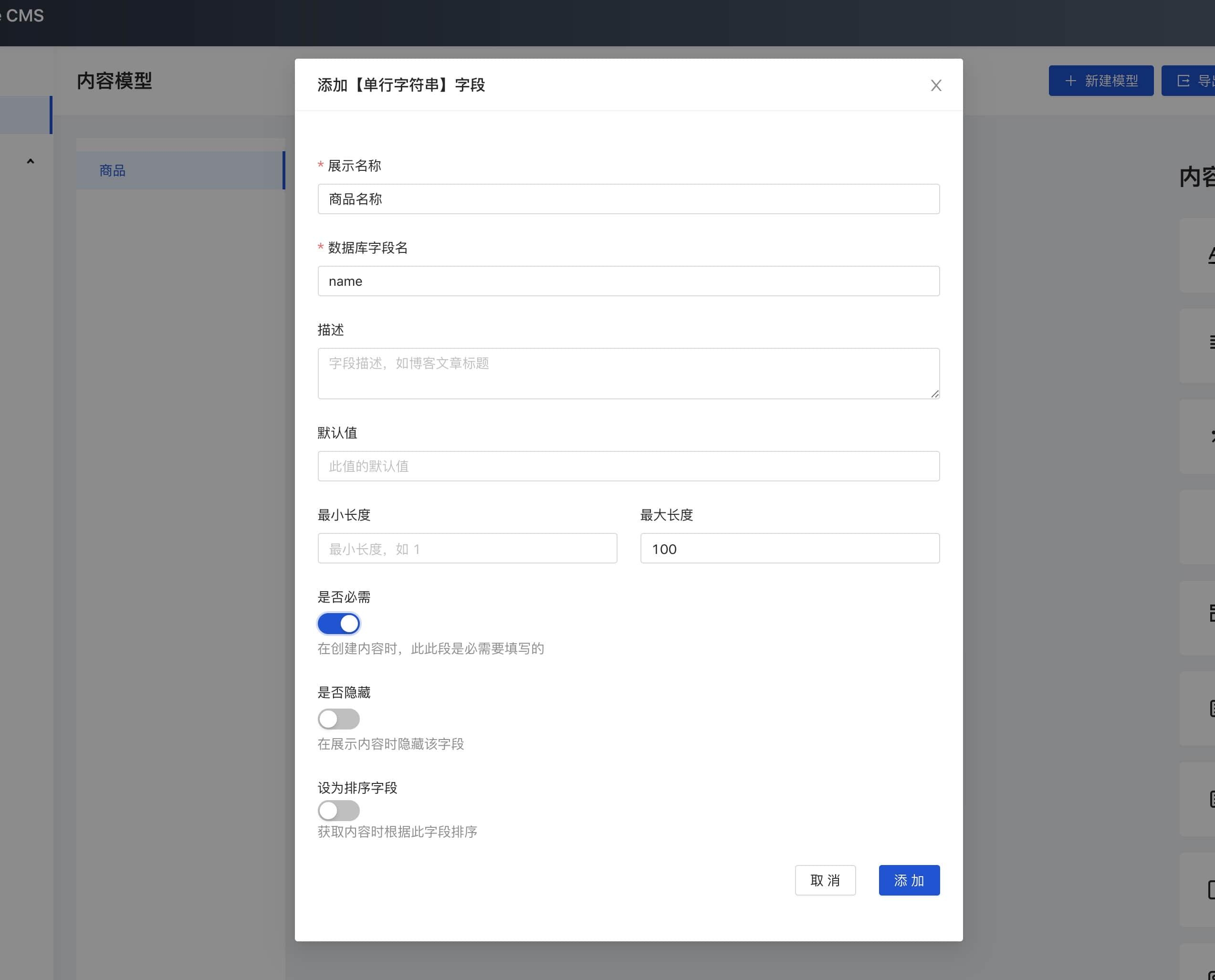 为商品添加商品名称属性,因为商品名称通常是比较短的文字,所以我们可以选择单行字符串字段,点击右侧的单行字符串卡片,填写商品名称的字段信息。除了基本的名称,数据库字段名之外,我们还可以为此字段添加其他的限制,如最大长度,限制填写商品名称时的最大长度,创建商品时,是否必需填写商品等。