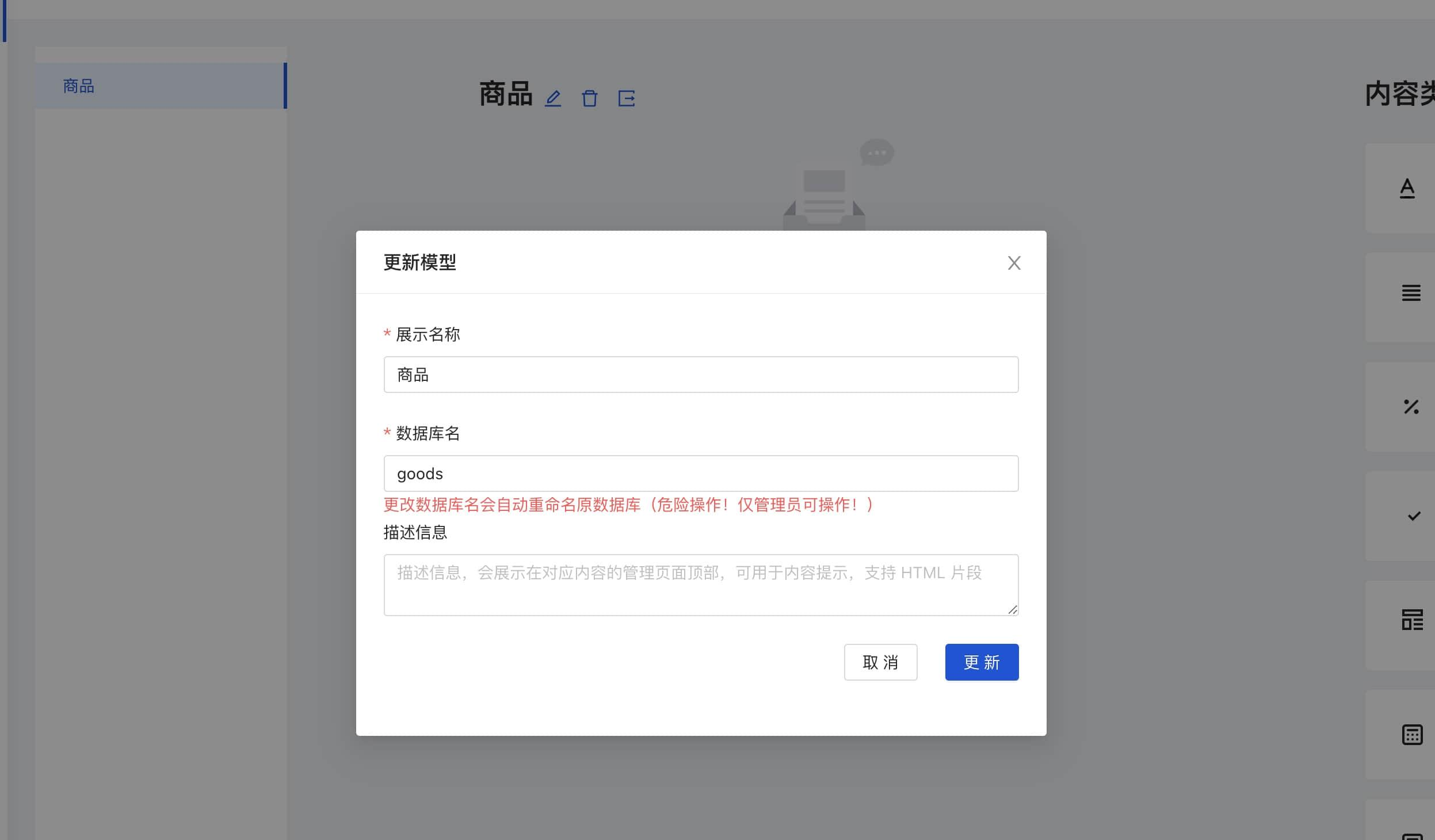创建一个名称为商品的内容模型,数据库名为 goods,即将商品数据存储到 goods 数据集合中。如果新建内容的时候指定的集合不存在,CloudBase CMS 会自动新建集合。