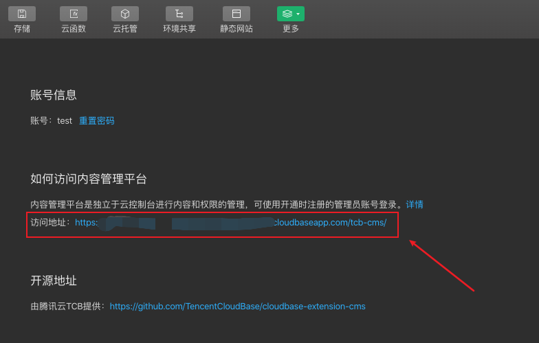(5)完成后,点击「更多」-「内容管理」,即可看到内容管理的入口和相关信息。点击访问地址,即可在弹出的窗口中进行内容管理的相关配置。