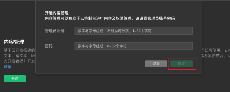 (3)开通内容管理需要填写管理员账号,填写账号后,点击「确定」完成。