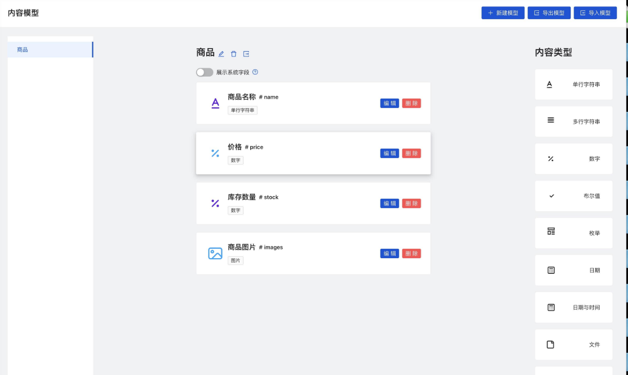 在创建完内容模型后,我们会得到一个空的内容模型。接下来,我们需要为商品添加商品名称,商品图片,价格,库存数量等字段。