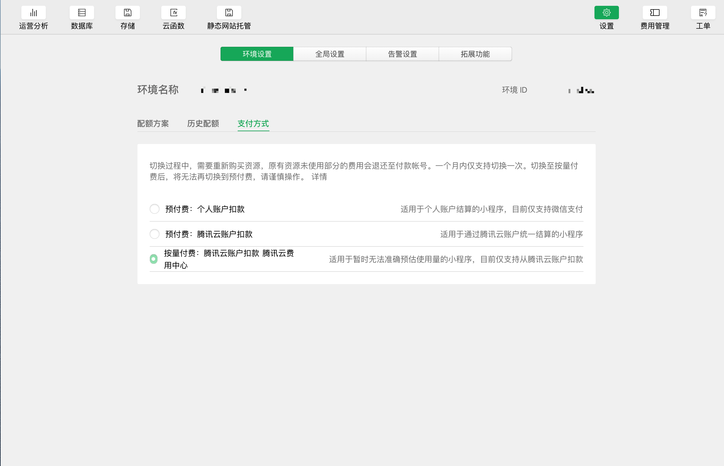 如果你的环境是预付费,请到设置中,将支付方式转换为按量付费