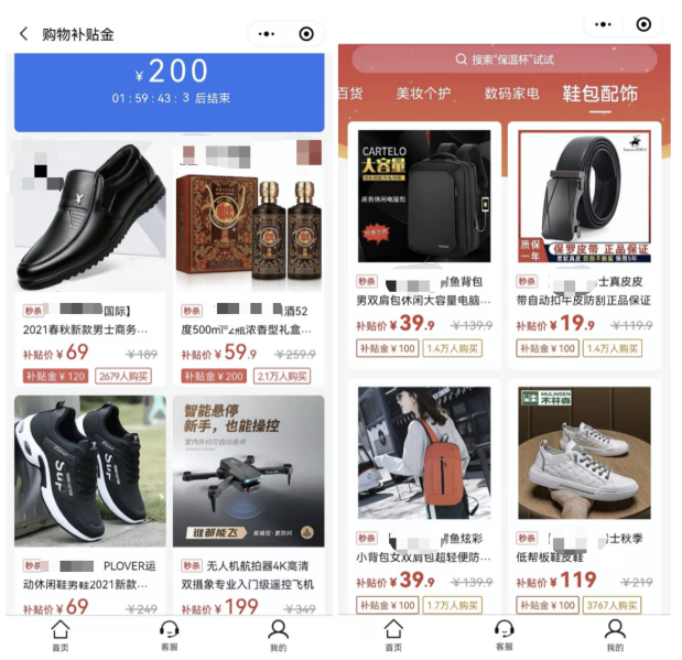 近期,发现平台中出现一些电商类小程序,通过优惠券/补贴金形式,利用欺骗性的优惠,诱导消费者购买商品。如商品本身市场售价为40元,却用100元的优惠补贴诱导消费者购买,优惠补贴后的价格实际为市场价格,属于价格欺诈行为。