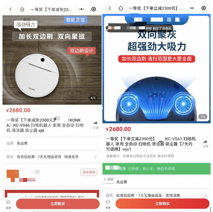2.优惠券欺诈:以大额优惠券吸引用户购买扫地机器人、空气净化器等产品。