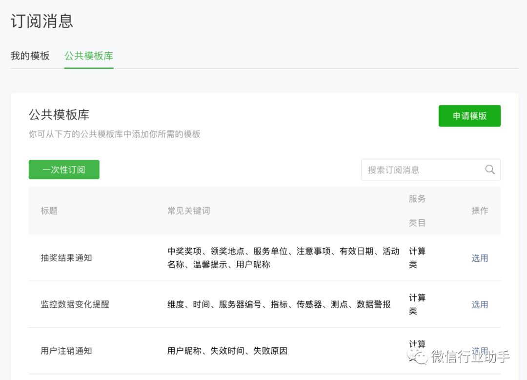 1)进入小程序后台,根据小程序类目选择/申请订阅消息模板,获取模板ID