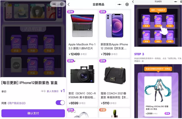 原价9元(新人1元)抽取一次盲盒,拆盒后可随机获得其中一款(包括手机、电脑、耳机等)商品,涉嫌以小博大;