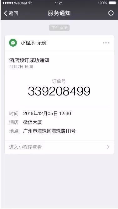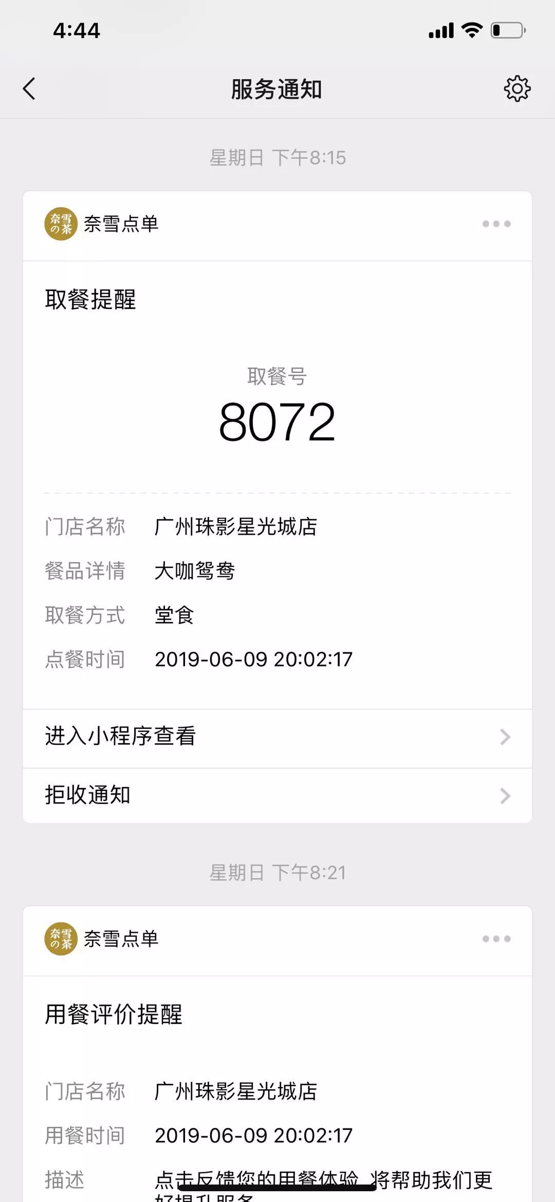 在预点单场景,用户在到达门店前提前在小程序内下单,通过模板消息发送取餐提醒。