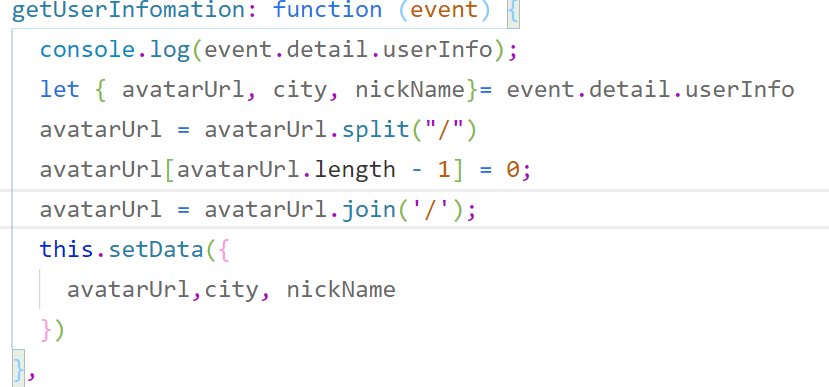 <button bindtap="getUserInfomation">点击获取用户信息</button>getUserInfomation(e){wx.getUserProfile({desc : '测试登录',success : (res) =>{let {avatarUrl , city , nickName} = res.userInfoavatarUrl = avatarUrl.split("/")avatarUrl[avatarUrl.length - 1] = 0;avatarUrl = avatarUrl.join('/');this.setData({avatarUrl , city , nickName})}})},