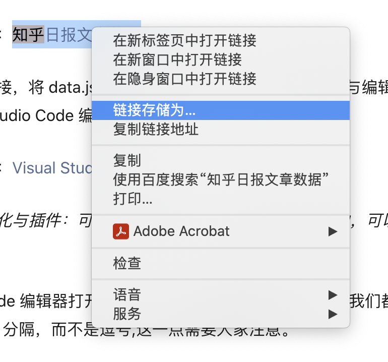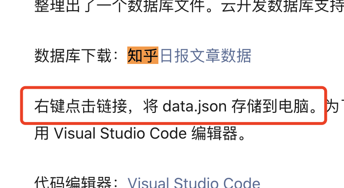 右键点击链接,将 data.json 存储到电脑。为了方便大家阅读与编辑 data.json 文件的内容,推荐大家使用 Visual Studio Code 编辑器。