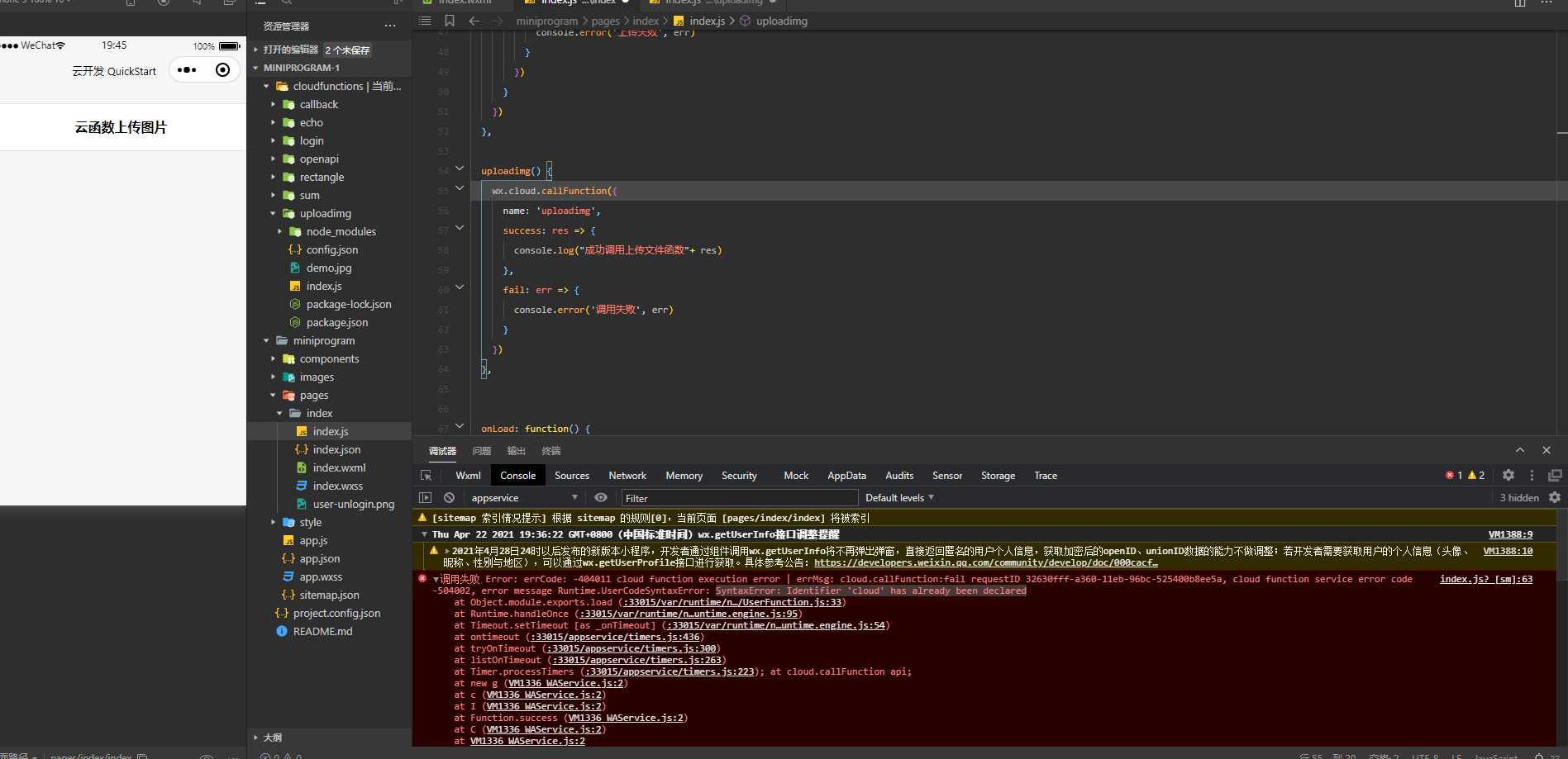 学习“小程序端上传图片到云存储”章节 cloud.callFunction 运行报错 谁知道是哪里的问题?