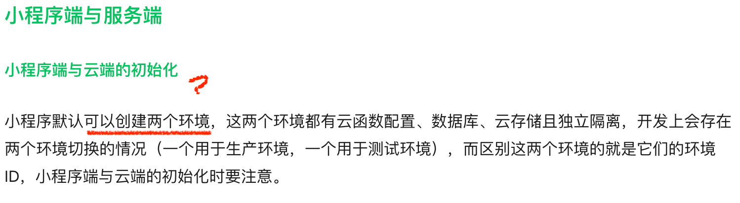小程序默认可以创建两个环境,这两个环境都有云函数配置、数据库、云存储且独立隔离,开发上会存在两个环境切换的情况(一个用于生产环境,一个用于测试环境),而区别这两个环境的就是它们的环境 ID,小程序端与云端的初始化时要注意。