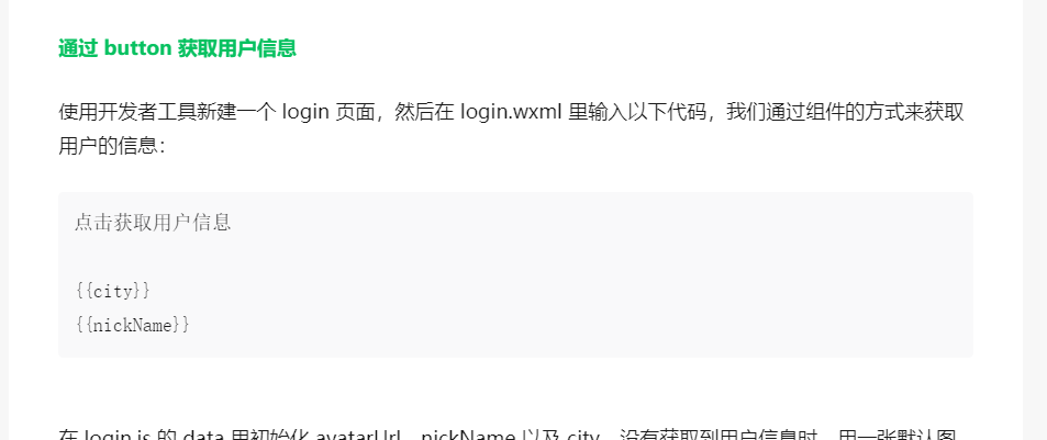 //然后在 login.js 文件里输入以下代码, //在事件处理函数 getUserInfomation 我们可以打印 event 对象, getUserInfomation: function (event) { console.log('getUserInfomation打印的事件对象', event) let { avatarUrl, city, nickName}= event.detail.userInfo this.setData({ avatarUrl,city, nickName }) }这到底怎么写啊?
