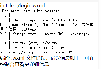 点击获取用户信息button> image> {{city}}view> {{nickName}}view>结果这样写之后页面根本不行,看看模拟器结果