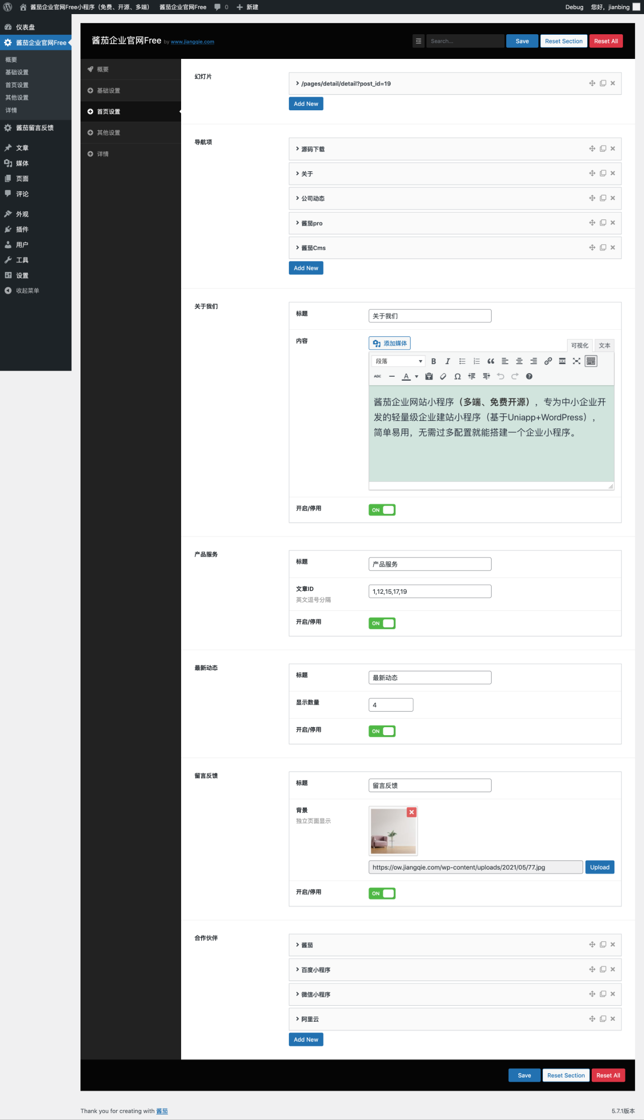 酱茄企业官网Free小程序,酱茄(www.jiangqie.com)专为中小企业开发的轻量级企业建站小程序(基于Uniapp+WordPress+php+mysql),后台操作简单,维护方便,无需过多配置就能搭建一个企业小程序。