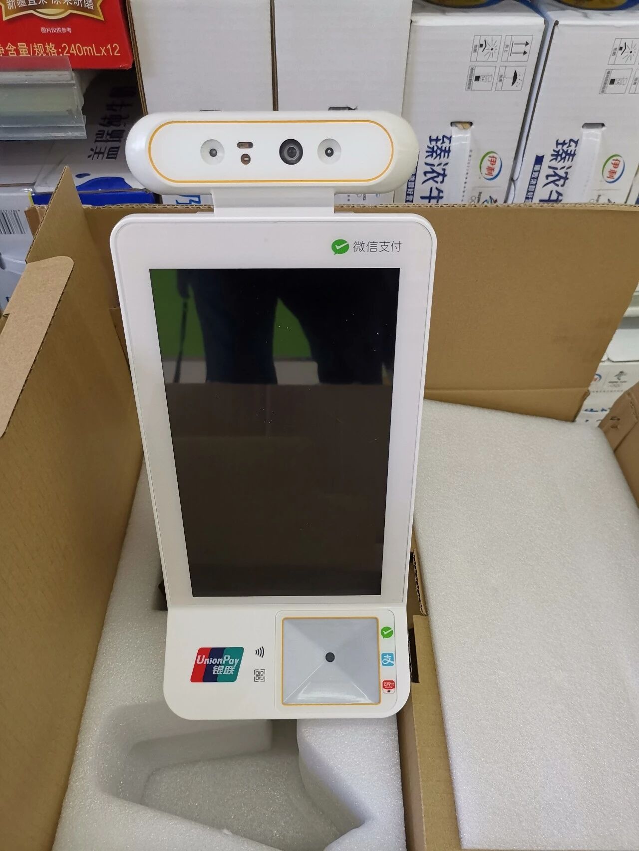 这一款设备我就简简单单的介绍一下吧,这是官方唯一一款设备,官方售价是1999-2250元,达标返1540,基本上都是这样,也有一些特殊原因,有些合作的同行跟的其他第三方公司,可能他们的政策会和我其他政策不一样,但是基本上我认为还是一样的,差别不太大,这一款设备功能我大概介绍一下,上面的摄像头支持微信刷脸和支付宝付款码,我们都知道支付宝和微信不是一家公司,所以你用微信的设备只能微信用户刷脸,支付宝用户是不支持刷脸的,但是支持支付宝用户付款码,这一款设备的唯一的好处就是,用户在第一次使用青蛙设备进行刷脸,是需要输入微信绑定的手机号,第二次不需要输入的,直接点击确认支付就可以了,但是其他微信刷脸产品,第二次是必须输入手机后四位的,这个问题我给大家解释一下,是我个人的观点,其他微信刷脸设备,只不过是第三方生产厂家买的微信官方的摄像头,然后生产的机器,也有可能是一些第三方技术公司委托生产厂家生产的机器,但是唯一不变的就是机器的摄像头,因为没有这个摄像头是没办法识别的,这个是微信官方的摄像头,里面有官方用户的数据,这样才能识别出来,