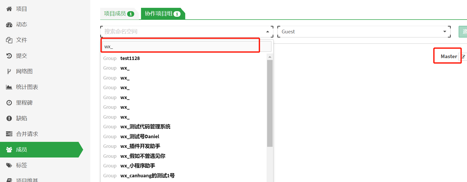 5、邀请项目组,随后记得把权限给到相应的权限,我这里直接给了Master