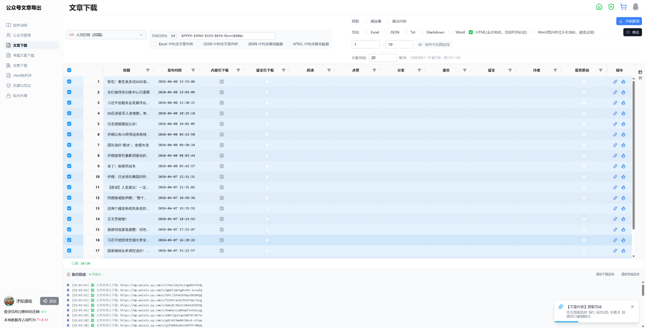 支持 HTML/JSON/Excel/TXT 多格式导出,100% 还原文章排版,批量获取阅读量、评论等运营数据