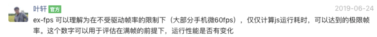 1、ex-fps 不是平均帧率,是极限帧率,可以理解为在不受驱动帧率的限制下(大部分手机微60fps),仅仅计算js运行耗时,可以达到的极限帧率。这个数字可以用于评估在满帧的前提下,运行性能是否有变化。